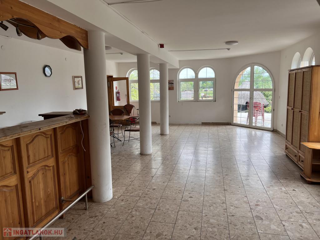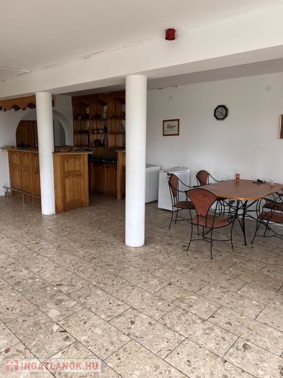 A bejárati szárnytól elindulva : reggeliző terem, étterem (50 fő befogadására alkalmas),hatalmas panorámás terasszal, egy bárral , konyha , 3 mosdó, 2 vendég wc, 1 személyzeti WC, személyzeti öltöző, tároló helyiség, iroda helyiség. egy privát lakrész 2 szobával (hálószoba és nappali), fürdőszobával