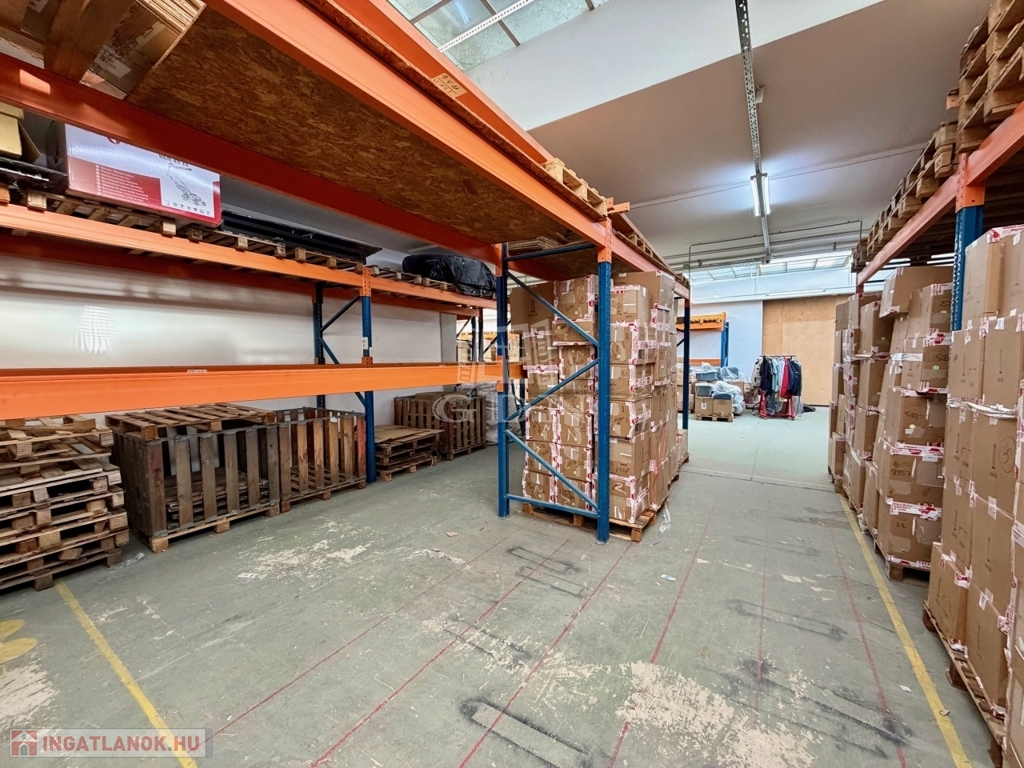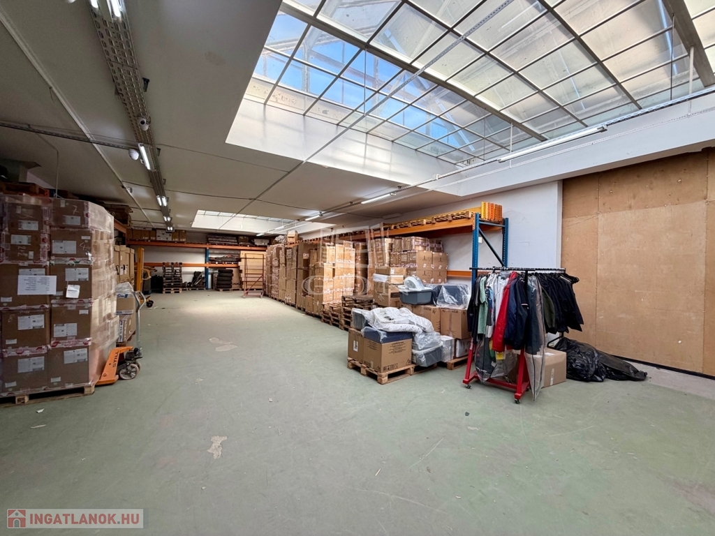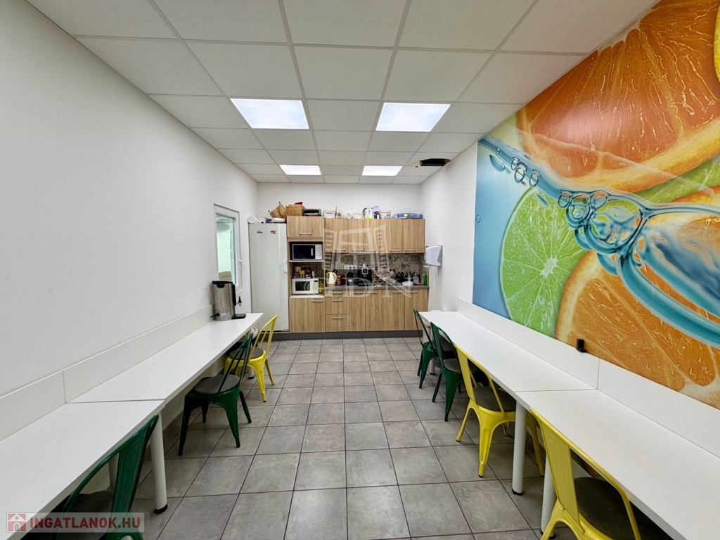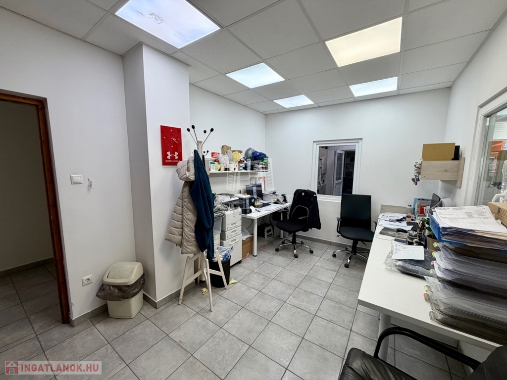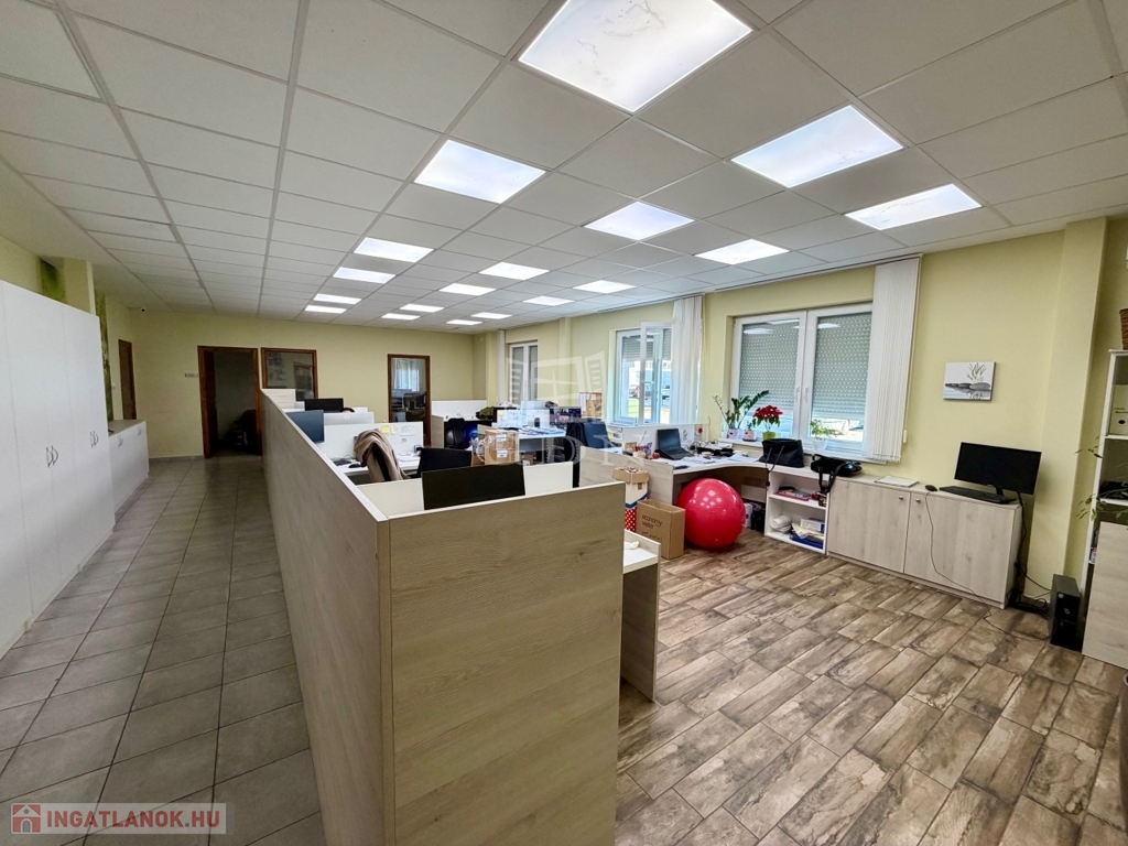 Az ingatlan kiépített szerves része a fent említett 240 m2 több helyiségből álló iroda, teakonyhával, vizesblokkal, öltözővel, amely padlófűtéssel, klímaberendezéssel rendelkezik.