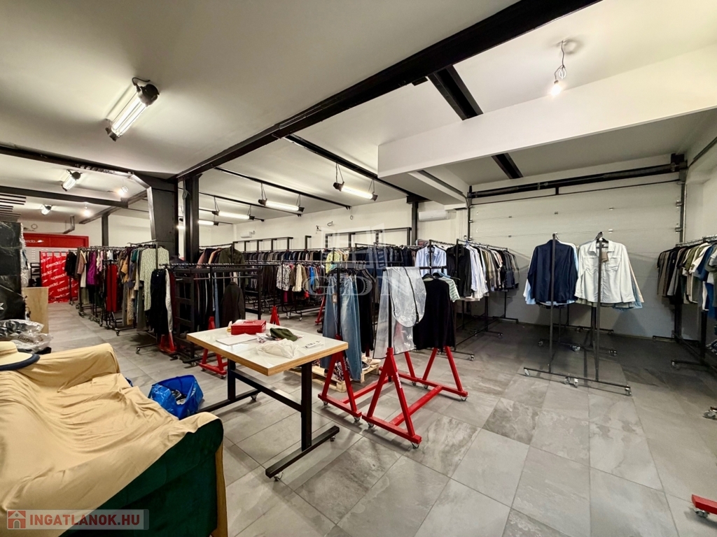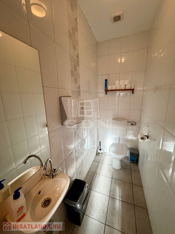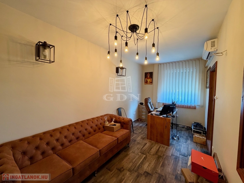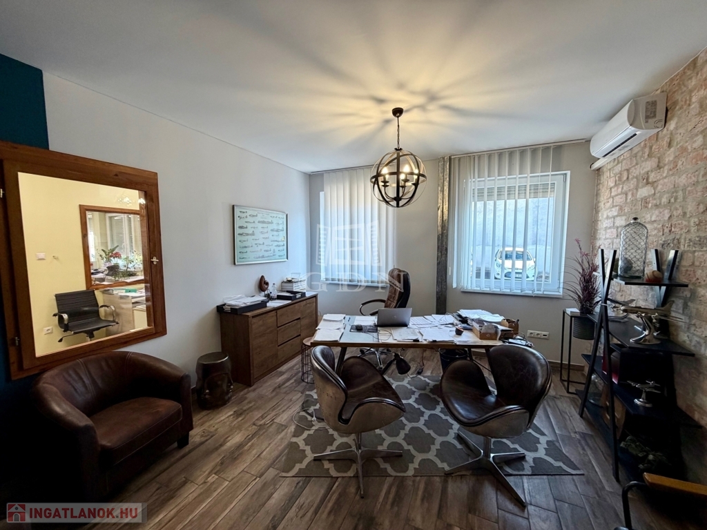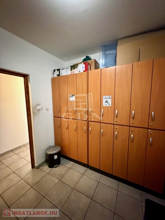 Az ingatlan kiépített szerves része a fent említett 240 m2 több helyiségből álló iroda, teakonyhával, vizesblokkal, öltözővel, amely padlófűtéssel, klímaberendezéssel rendelkezik.