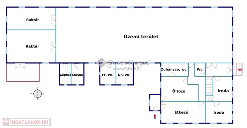 -az 1710 m2 felépítmény magába foglalja a 1090 m2-es üzemet, 180 m2-en raktárakat, 5 db irodát 120 m2-en, a fennmaradó 320 m2-en szociális helyiségeket ( öltöző, mosdók, wc-k, étkező) találunk