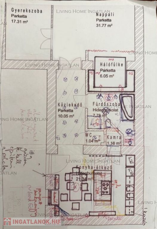 Beosztás: tágas előtér, konyha, tároló, külön wc, kádas-tusolós fürdő, 2 szoba hálófülkével.