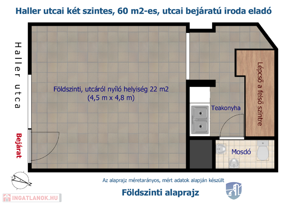 A 31 m2-es földszinten UTCÁRÓL NYÍLÓ, VILÁGOS IRODAHELYISÉG, valamint egy teakonyha és mosdó áll rendelkezésre. A 29 m2-es, szintén ablakos felső szintre – az alaprajz szerinti kiépítésben – belső lépcső vezet, mely akár az iroda elejébe is áthelyezhető.