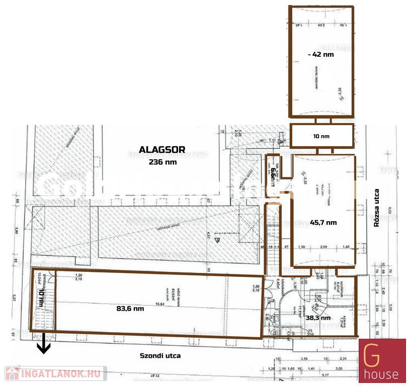 Alagsor (236 nm): 3 nagy helyiség: 83 nm, 46 nm és 42 nm, közlekedő, szauna-tér, vizesblokk