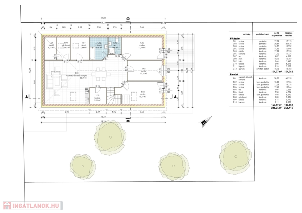 A két ingatlan úgy oszlik meg, hogy a földszinten van 144 nm hasznos lakótér és az emeleten pedig 101 nm.