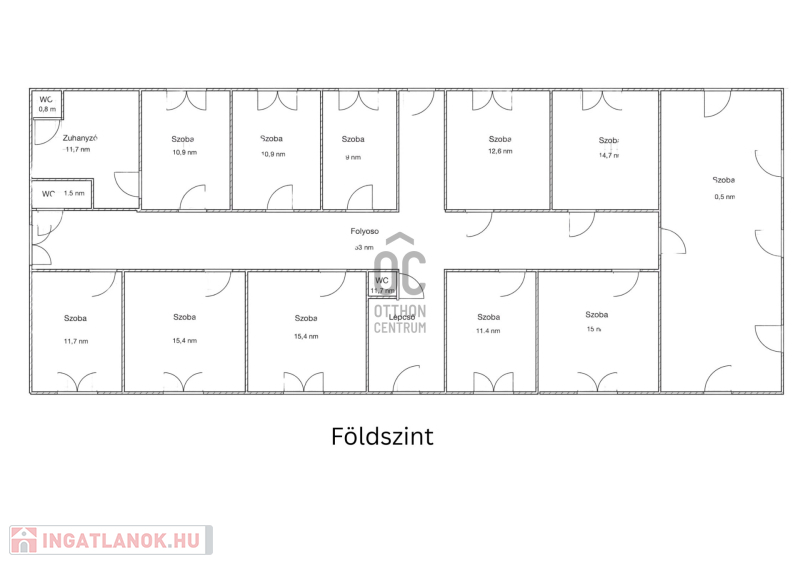 Az épület földszinti része 234 m², 10 irodával, mellékhelyiségekkel és tágas folyosóval.