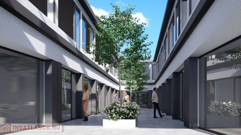 - térkővel burkolt közös udvar, növényzettel, pihenővel