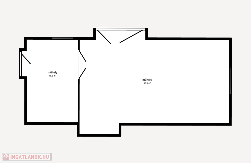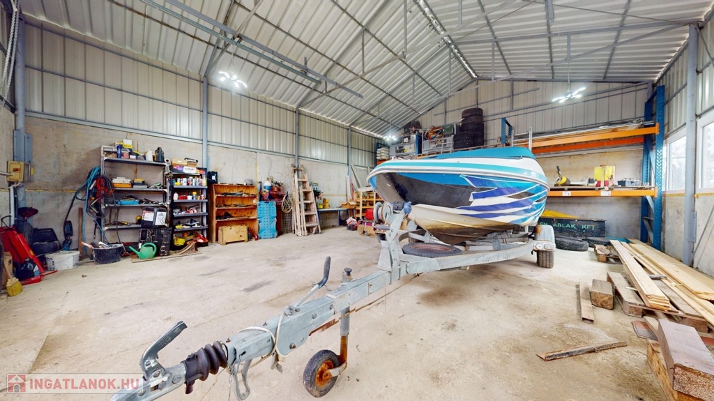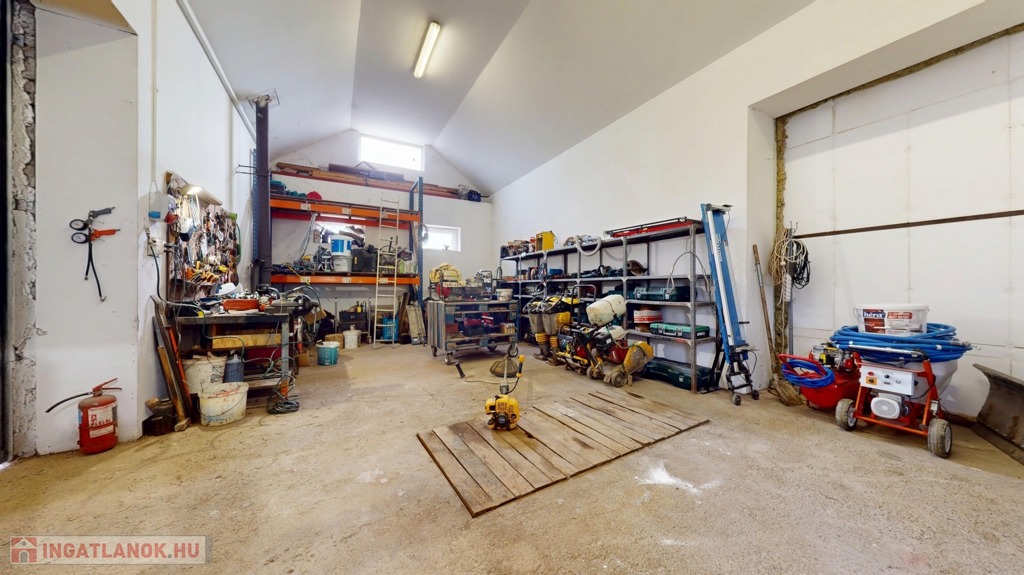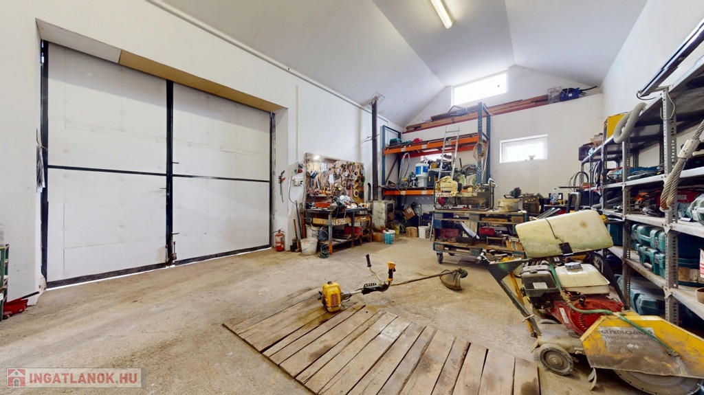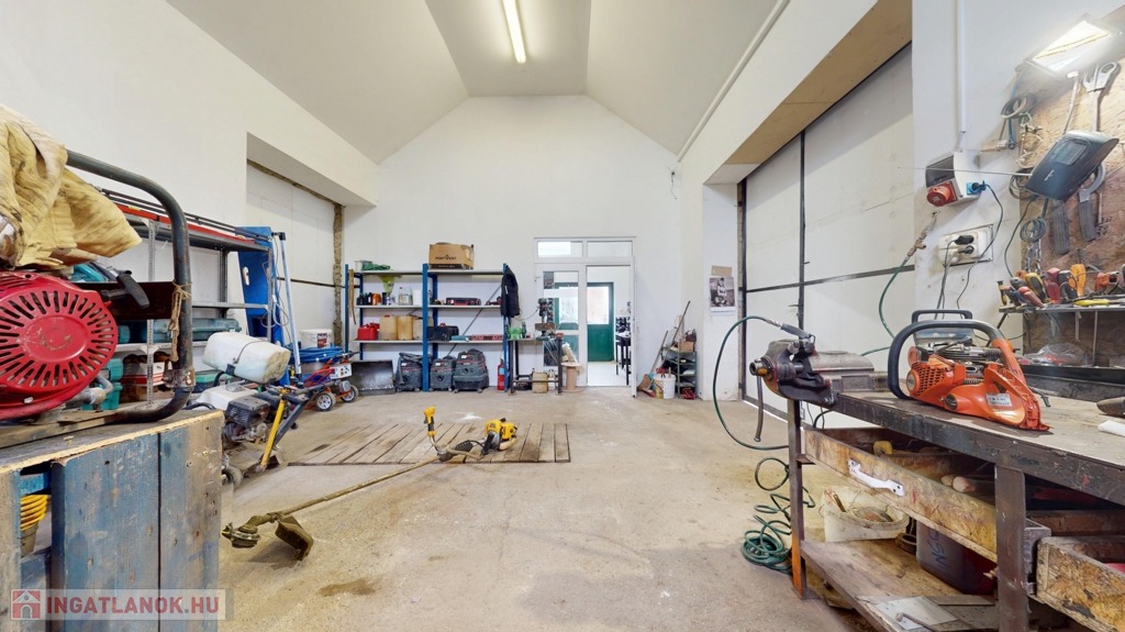 Külön található egy könnyűszerkezetes műhely, kb. 5 méteres belmagassággal, ami ritka és rendkívül sok lehetőséget kínál (autószerelés, gyártás, raktározás stb.).