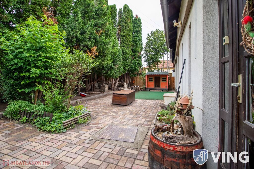 A ház mellett térkövezett, fedett terasz is található. A rendezett udvaron szintén térkövezett járdákon lehet közlekedni. A ház előtt 3 autó parkolására alkalmas, saját parkoló található.