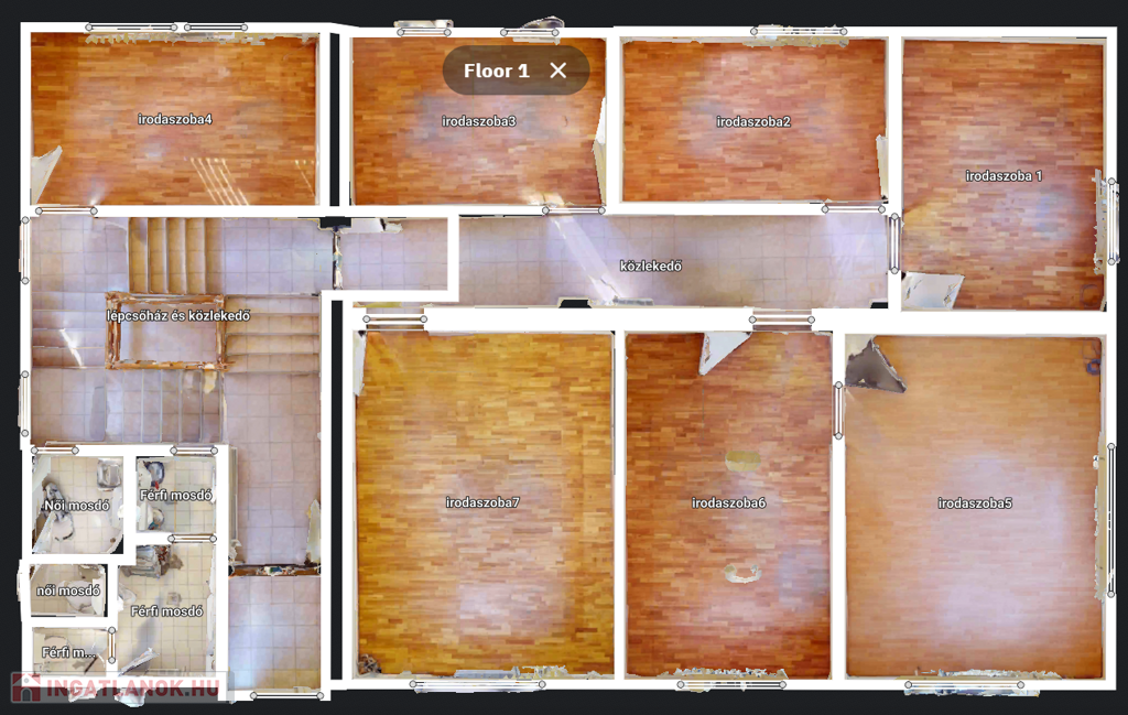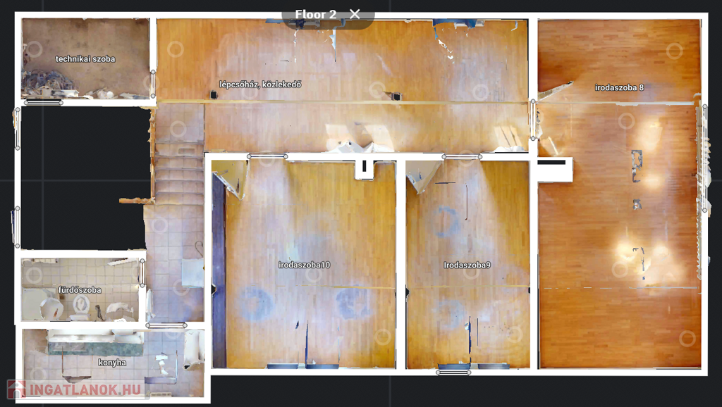 -Belső elrendezés: 10 külön irodahelyiség, szerver szoba, konyha, külön férfi és női mosdók, zuhanyzó és WC