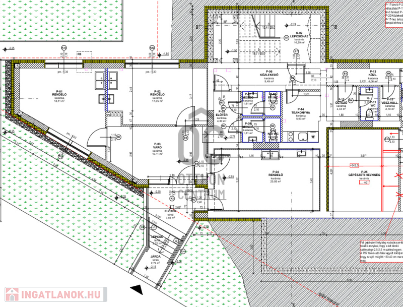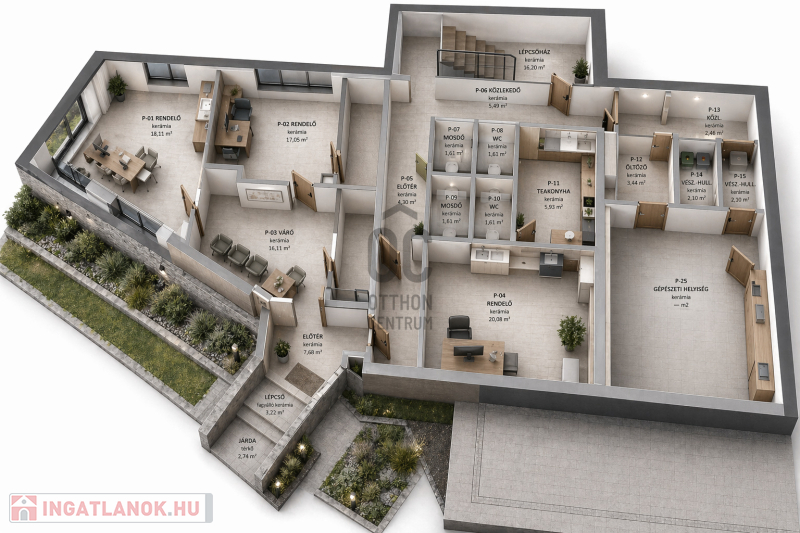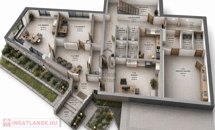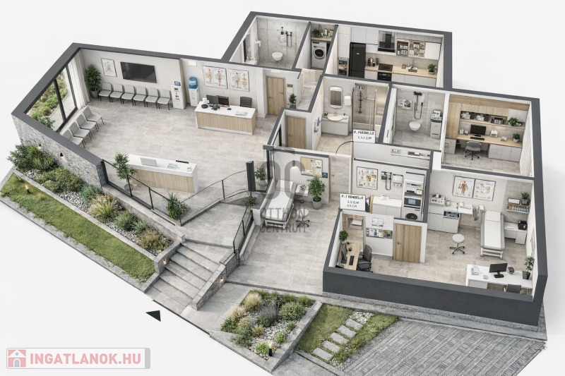 -Jelenlegi kialakítás szerint 3 rendelő kerül kialakításra, melyek18-20nm közöttiek, emellett egy közös váró, illemhelyiségek, teakonyha és öltöző-személyzeti illemhelyiséggel kerül építésre.