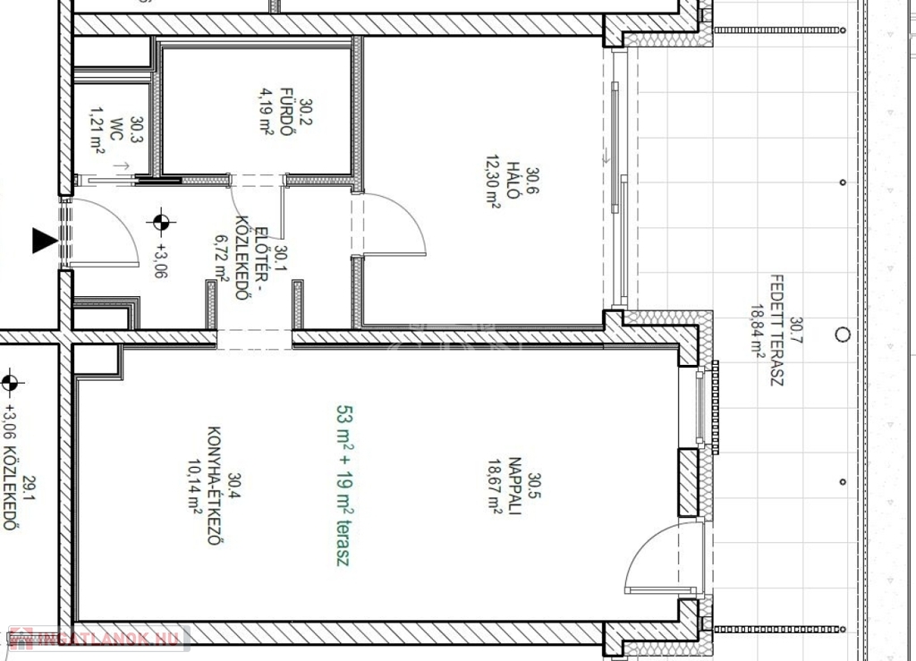 Ez a lakás nappali+1 hálós, 53nm alapterületű+ tartozik hozzá egy 19nm-es fedett terasz is.