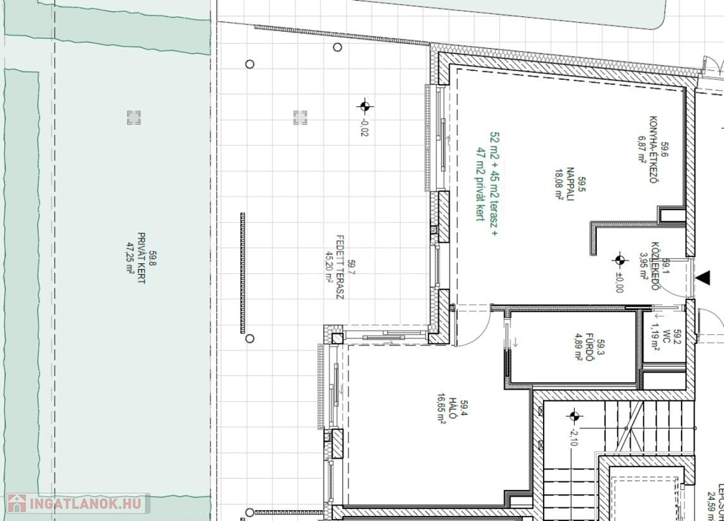 Ez a lakás nappali+1 hálós, 52nm alapterületű+ tartozik hozzá egy 45nm-es fedett terasz és 47nm privát kert is.