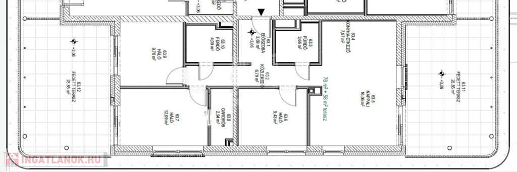 Ez a lakás nappali+3 hálós, 76nm alapterületű+ tartozik hozzá két (29nm+29nm) összesen 58nm fedett terasz is.
