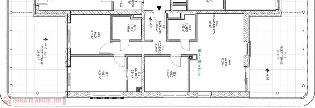 Ez a lakás nappali+3 hálós, 76nm alapterületű+ tartozik hozzá két (29nm+29nm) összesen 58nm fedett terasz is.