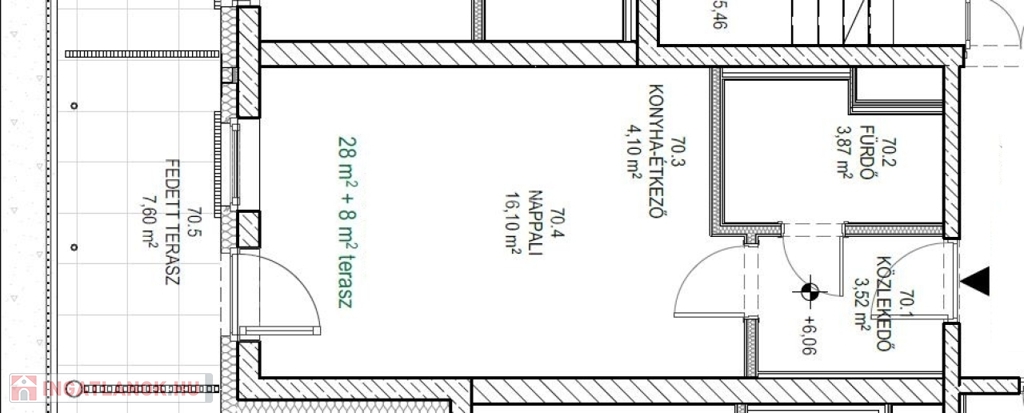 Ez a garzonlakás 28nm alapterületű+ tartozik hozzá egy 8nm-es fedett terasz is.