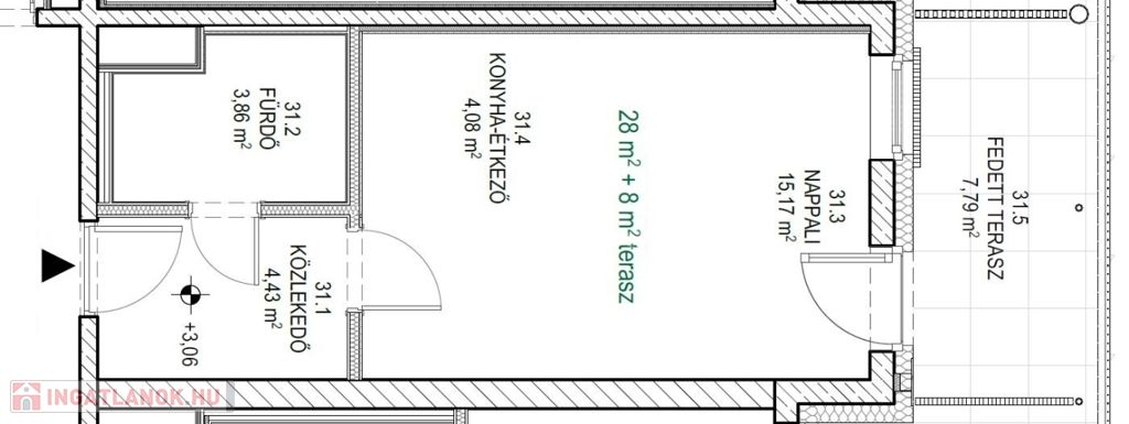 Ez a garzonlakás 28nm alapterületű+ tartozik hozzá egy 8nm-es fedett terasz is.
