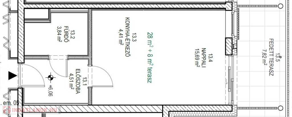 Ez a garzonlakás 28nm alapterületű+ tartozik hozzá egy 8nm-es fedett terasz is.