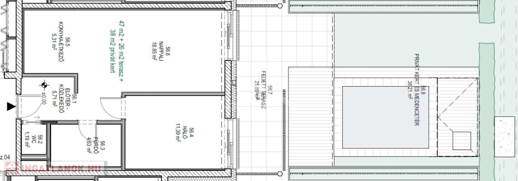 Ez a lakás nappali+1 hálós, 47nm alapterületű+ tartozik hozzá egy 26nm-es fedett terasz és 38nm privát kert is.