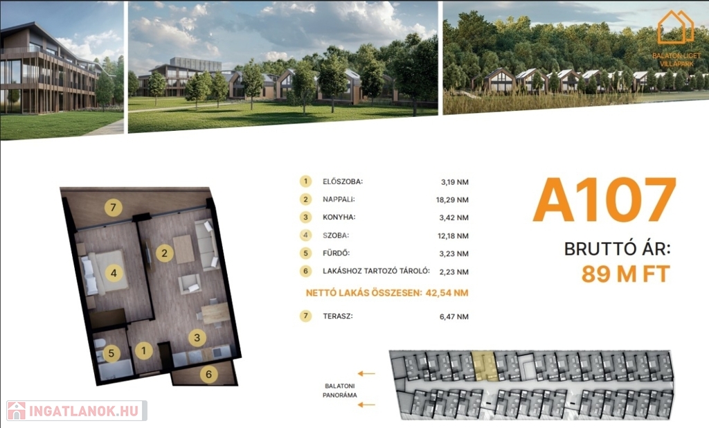 Az első emeleten további 21 lakás érhető el, 47–75 m² közötti méretben.