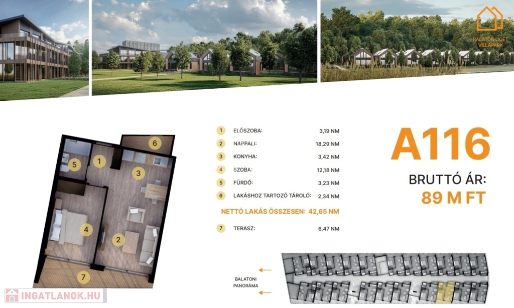 Az első emeleten további 21 lakás érhető el, 47–75 m² közötti méretben.