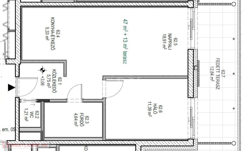 Ez a lakás nappali+1 hálós, 47nm alapterületű+ tartozik hozzá egy 13nm-es fedett terasz is.