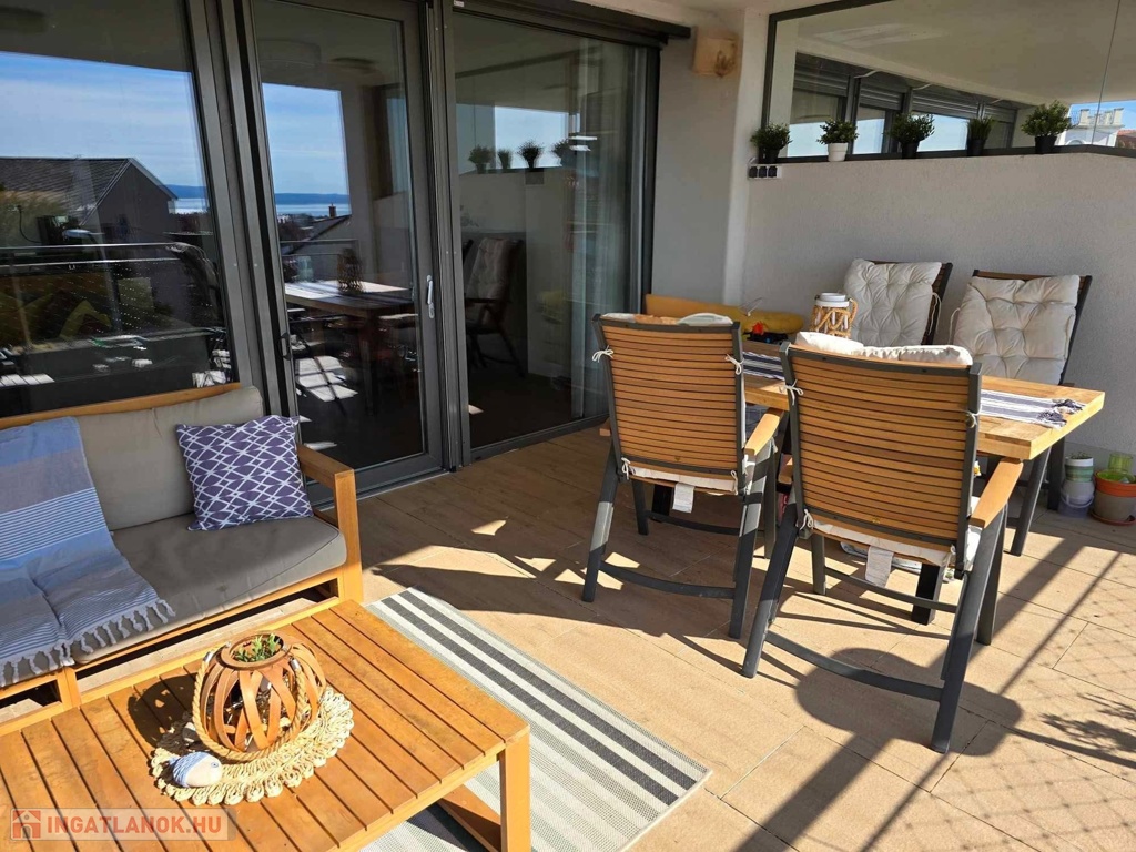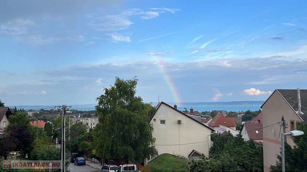 A 83 m²-es ingatlan praktikus elosztású: tágas, közel 40 m²-es nappali–konyha–étkező, 2 külön nyíló hálószoba, fürdőszoba, valamint külön vendég WC biztosítja a kényelmes mindennapokat. A nappaliból nyíló, 26 m²-es fedett teraszról gyönyörű panoráma nyílik a Balatonra és a Tihanyi-félsziget irányába.