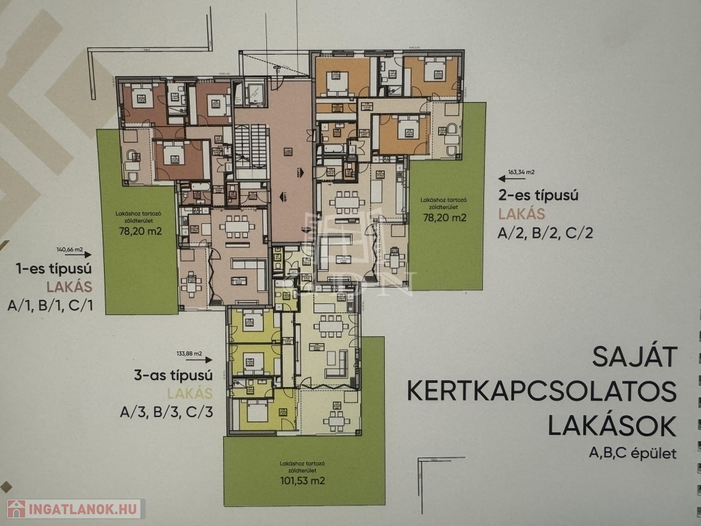 Az A 1-es típusú lakás 115,91 négyzetméteres, amelyhez 78,2 négyzetméteres saját kertkapcsolat
