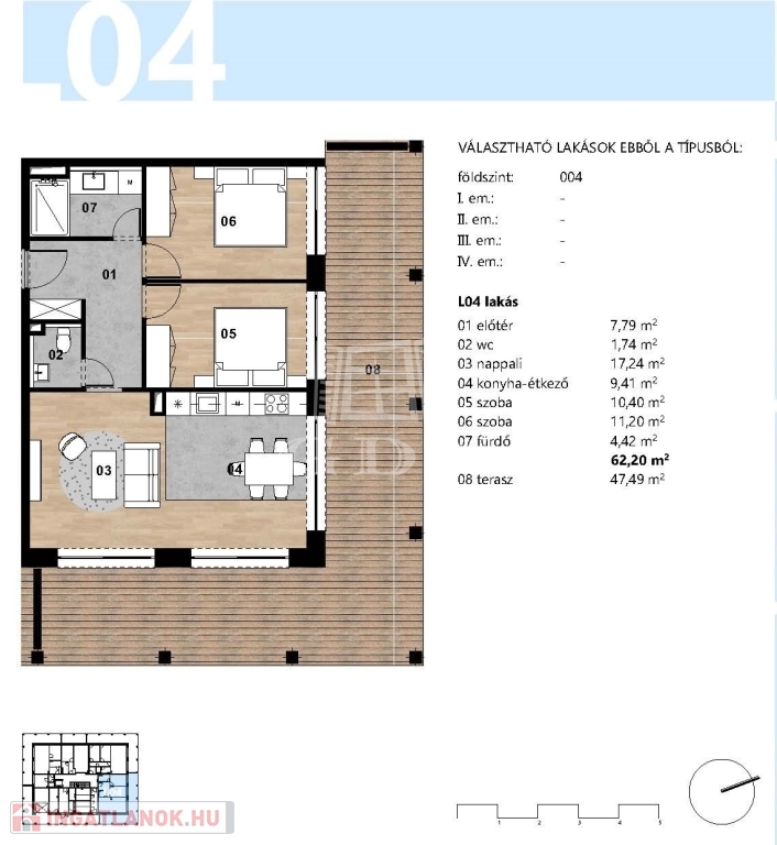 62 nm-es, 3 szobás, 47 nm-es terasszal, elismert szakmai háttérrel rendelkező tervezőiroda által megálmodott lakás, fűtéskész, 2026-ban történő átadással eladó.