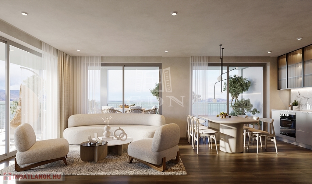 Balatonmáriafürdő központi részén, körbekerített parkosított telken, saját partszakasszal rendelkező lakóparkban, harmadik emeleti,
