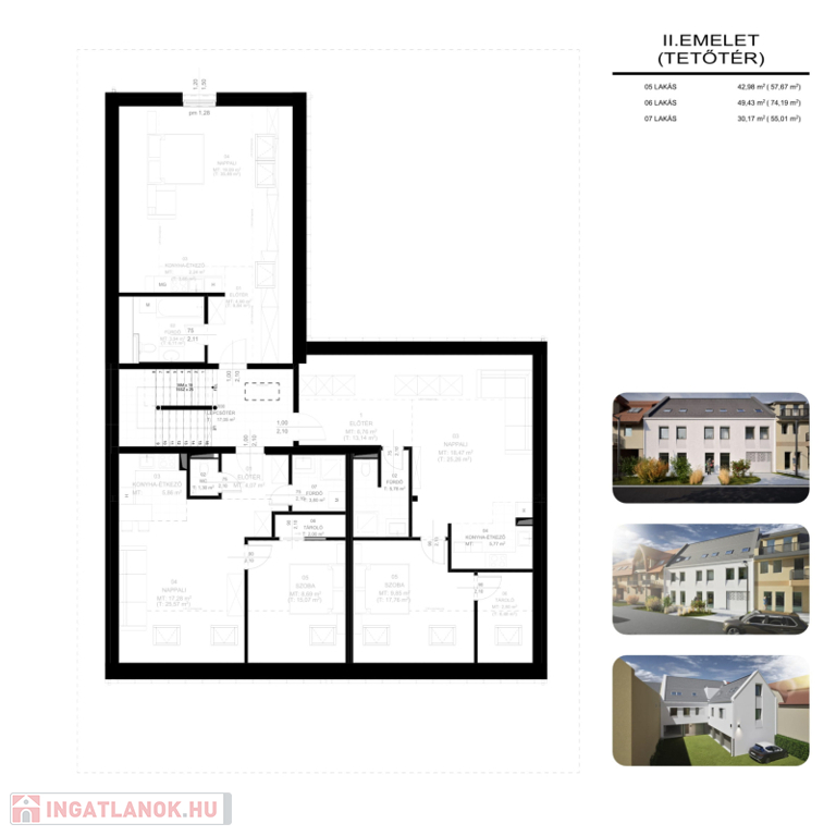 A hirdetésben szereplő 2. emeleti, lakás 30 m2 nettó / bruttó 55 m2-es (tetőtéri)