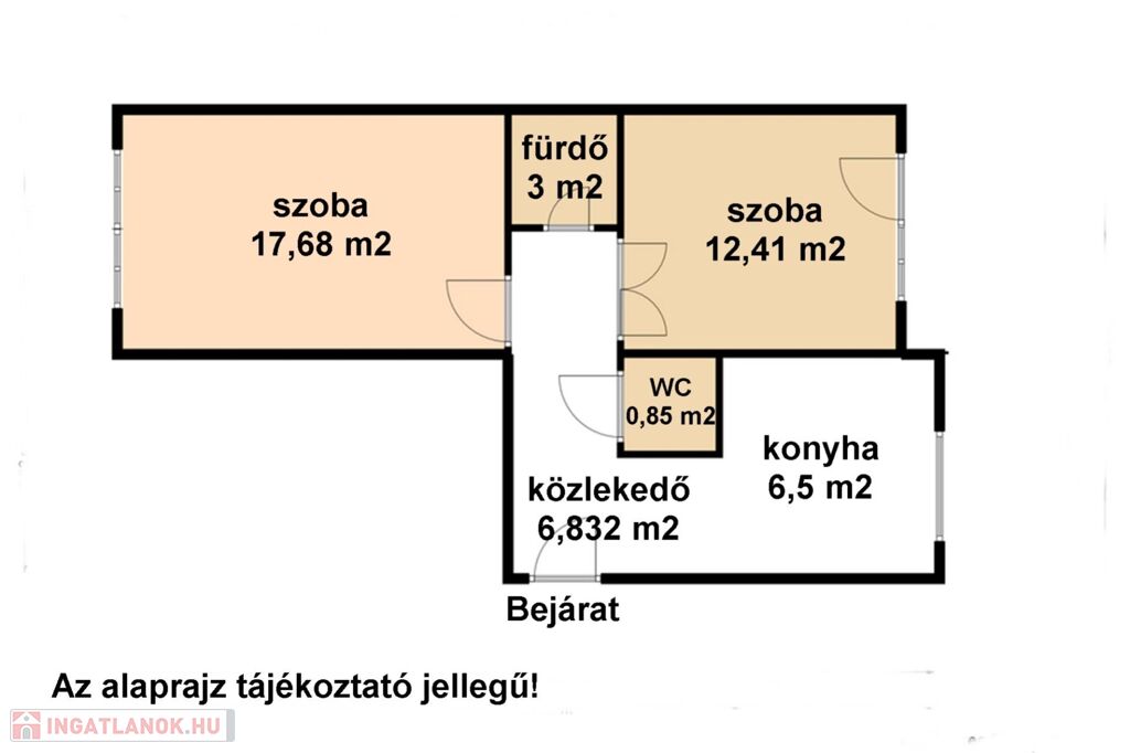Az ingatlan 48 m²-es lakótérrel rendelkezik: két szoba, konyha, fürdőszoba, WC.