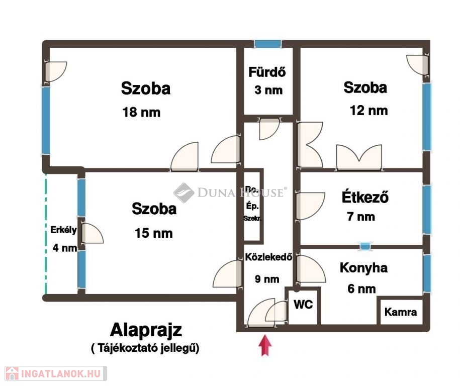 - három szoba (18,15 és 12 nm)