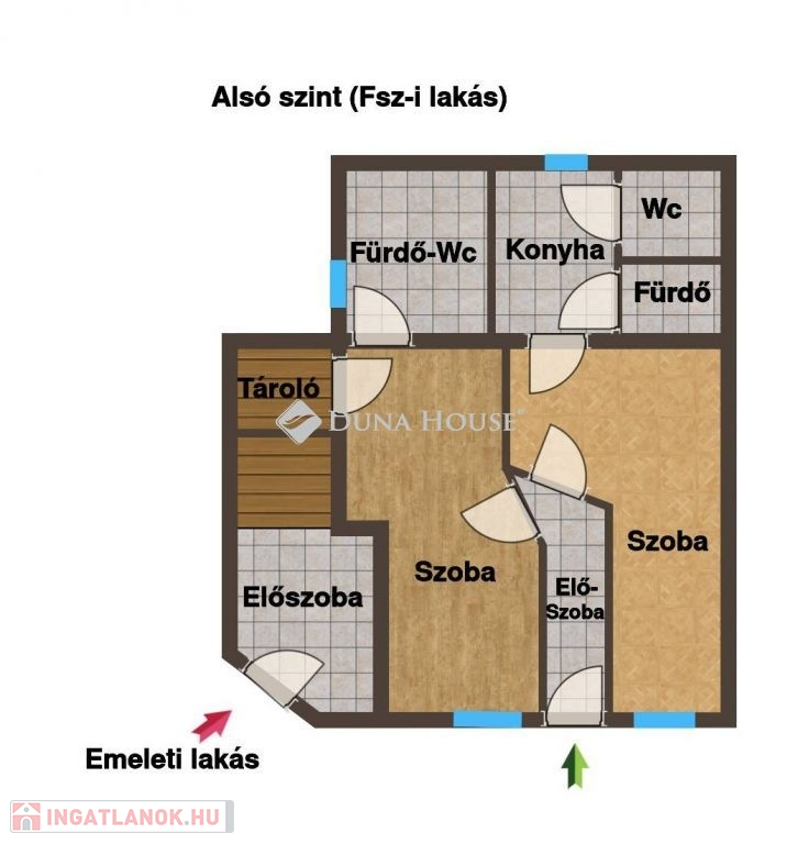 1. Belső 2 szintes otthon: amerikai konyha-nappali+ 2 szoba+2 fürdő-wc elosztással