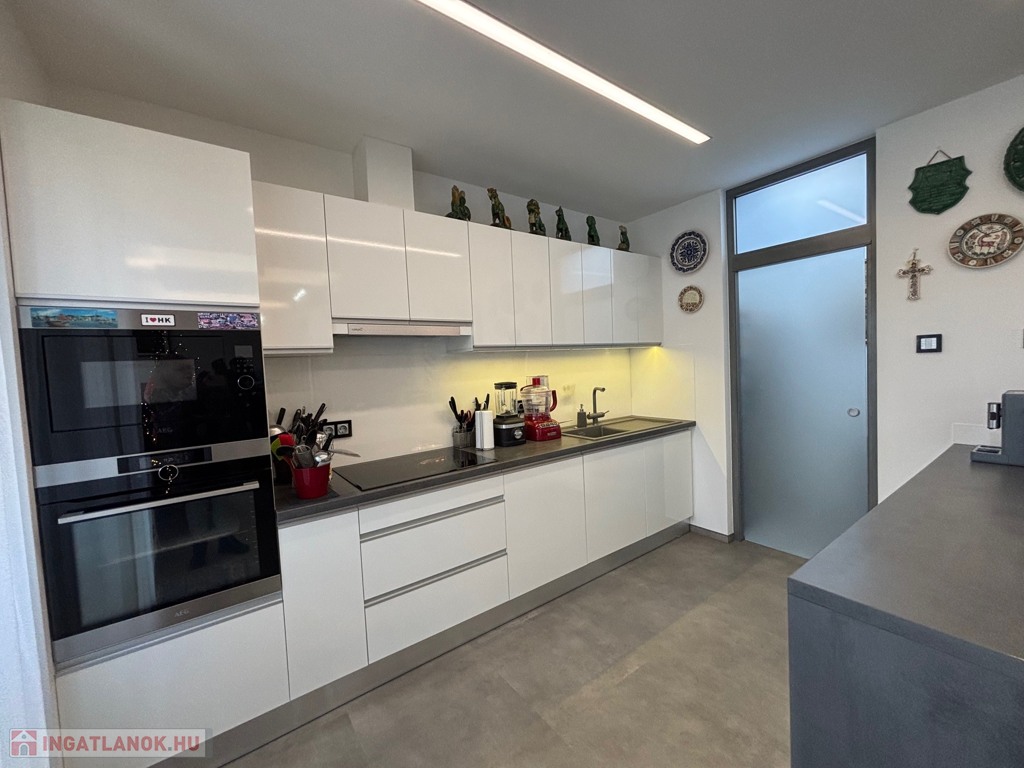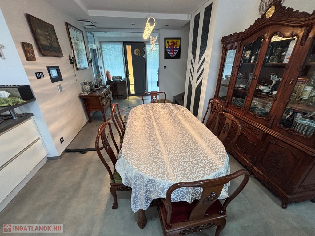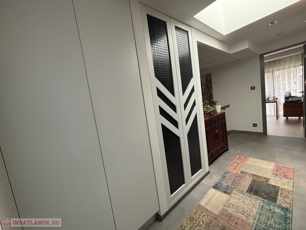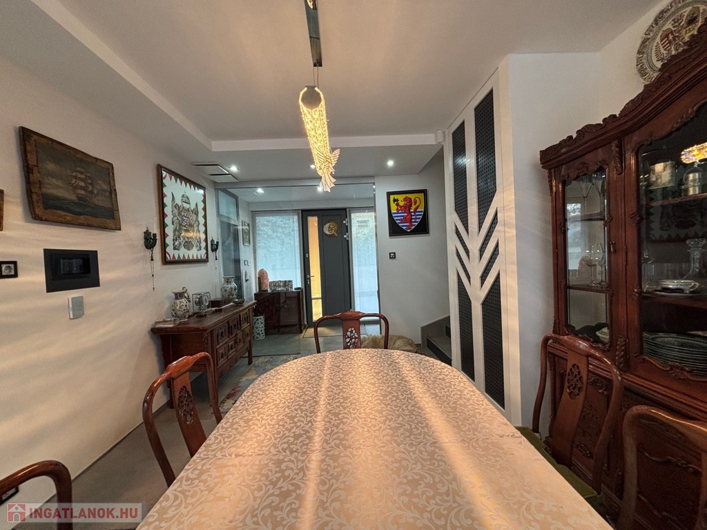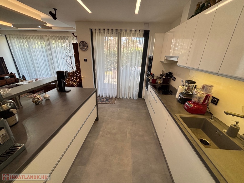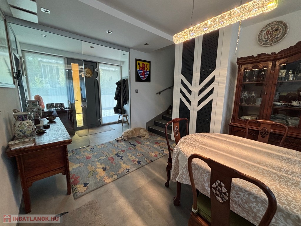 Budaörsön, szuper helyen, gyönyörű, luxus ikerház fél került eladásra. A ház 149 nm, négy szoba, három hálószoba és nagyméretű amerikai konyhás-nappali. A házban belépve az előtérben, jobbra található a gardrób szoba beépített szekrénnyel – háztartási heliység és zuhanyzó, balra a modern vendég mosdó. A nappaliból egy 31,6 nm-es teraszon lehet élvezni az ingatlanhoz tartozó kertet ami 109 nm-es. A 11 nm-es konyha minden szükséges háztartási géppel van felszerelve ( AEG márka ) , 4 nm-es kamra egészíti ki. Kényelmes lépcsők vezetnek a felső szintre, ahol, sok beépített szekrény található a halban, ahonnan nyílnak a hálószobák: kettő 20 nm. főlőtt és egy 12 nm-es . A hálószobákban beépített szekrények vannak. A fenti részen található egy nagy fürdőszoba káddal és zuhanyzóval, dupla mosdóval. Modern, optikai elektromos vezetékes rendszer van a házban kiépítve. A fűtés, hűtés hőszivattyúval működik és a hőmérséklet helységenként programozható. Padlófűtés és befúvásos fűtés is van. A rendszer interneten készül, mobiltelefonról is figyelhető, üzemeltethető.