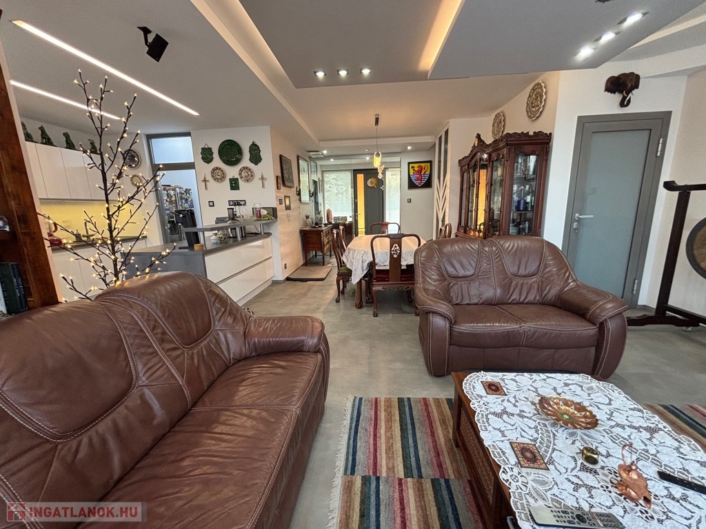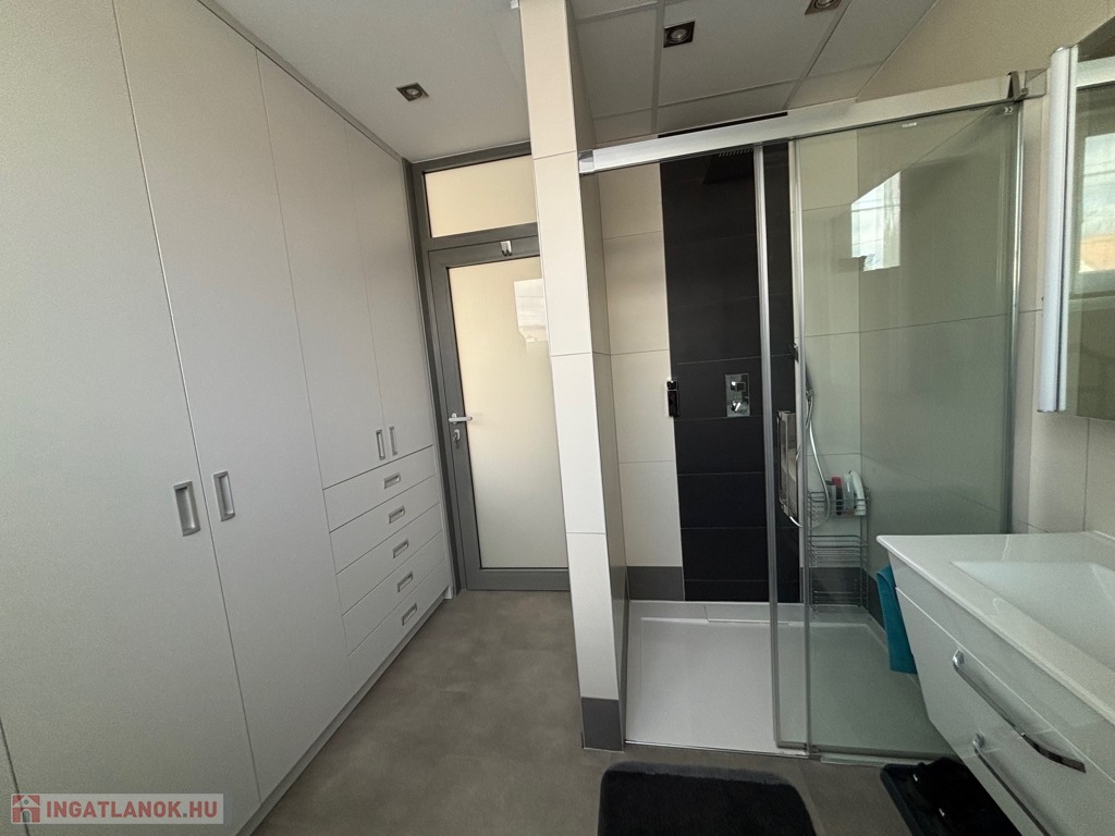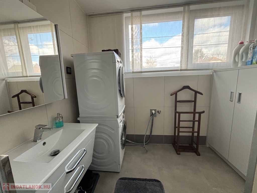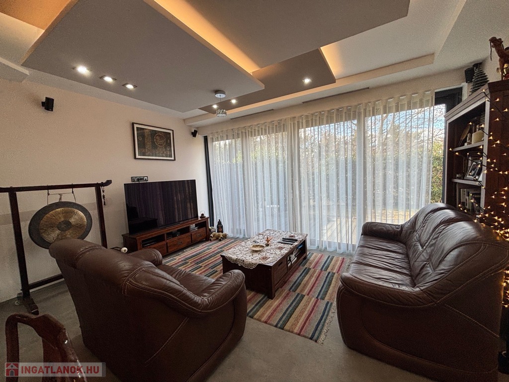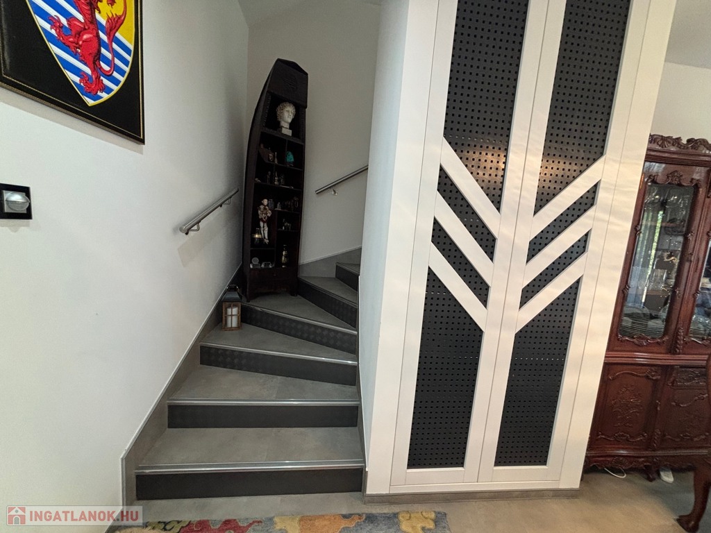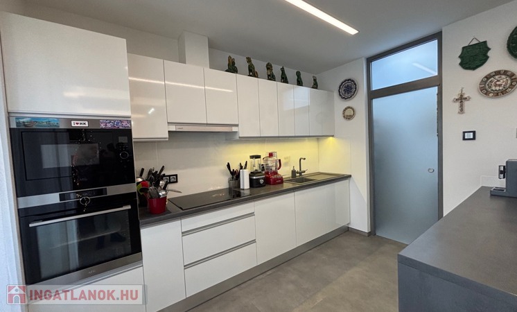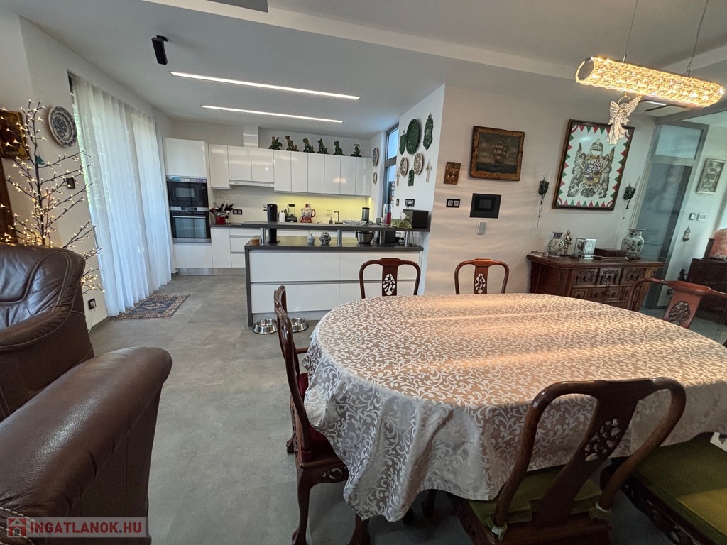 Budaörsön, szuper helyen, gyönyörű, luxus ikerház fél került eladásra. A ház 149 nm, négy szoba, három hálószoba és nagyméretű amerikai konyhás-nappali. A házban belépve az előtérben, jobbra található a gardrób szoba beépített szekrénnyel – háztartási heliység és zuhanyzó, balra a modern vendég mosdó. A nappaliból egy 31,6 nm-es teraszon lehet élvezni az ingatlanhoz tartozó kertet ami 109 nm-es. A 11 nm-es konyha minden szükséges háztartási géppel van felszerelve ( AEG márka ) , 4 nm-es kamra egészíti ki. Kényelmes lépcsők vezetnek a felső szintre, ahol, sok beépített szekrény található a halban, ahonnan nyílnak a hálószobák: kettő 20 nm. főlőtt és egy 12 nm-es . A hálószobákban beépített szekrények vannak. A fenti részen található egy nagy fürdőszoba káddal és zuhanyzóval, dupla mosdóval. Modern, optikai elektromos vezetékes rendszer van a házban kiépítve. A fűtés, hűtés hőszivattyúval működik és a hőmérséklet helységenként programozható. Padlófűtés és befúvásos fűtés is van. A rendszer interneten készül, mobiltelefonról is figyelhető, üzemeltethető.