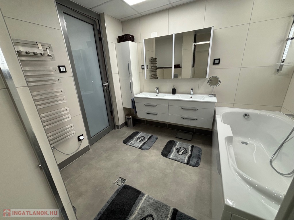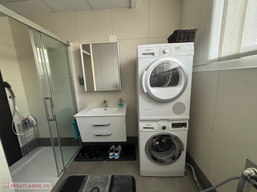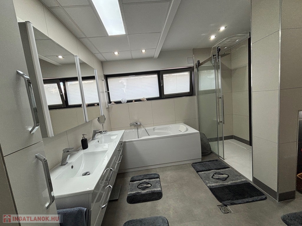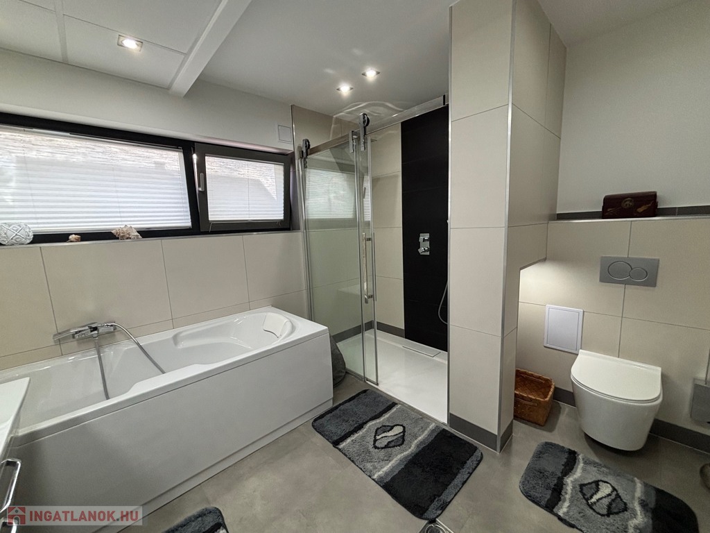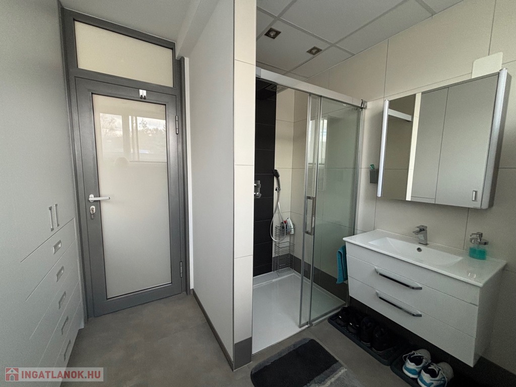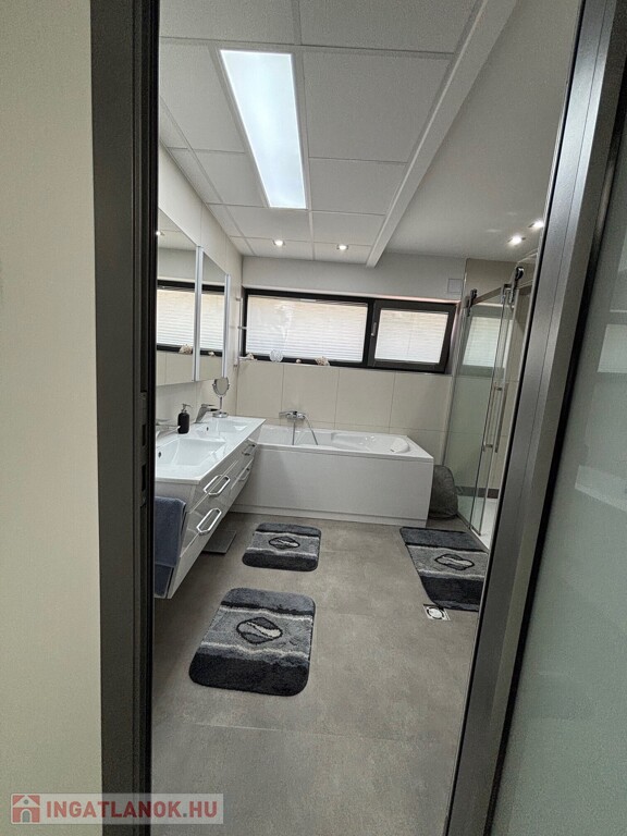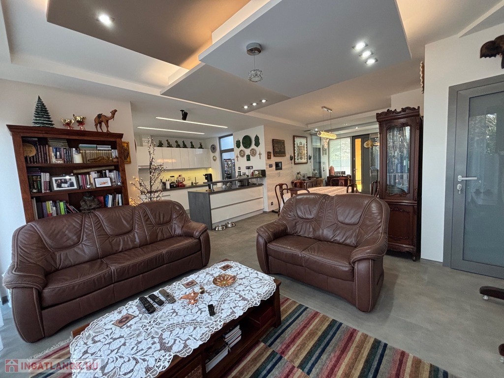Budaörsön, szuper helyen, gyönyörű, luxus ikerház fél került eladásra. A ház 149 nm, négy szoba, három hálószoba és nagyméretű amerikai konyhás-nappali. A házban belépve az előtérben, jobbra található a gardrób szoba beépített szekrénnyel – háztartási heliység és zuhanyzó, balra a modern vendég mosdó. A nappaliból egy 31,6 nm-es teraszon lehet élvezni az ingatlanhoz tartozó kertet ami 109 nm-es. A 11 nm-es konyha minden szükséges háztartási géppel van felszerelve ( AEG márka ) , 4 nm-es kamra egészíti ki. Kényelmes lépcsők vezetnek a felső szintre, ahol, sok beépített szekrény található a halban, ahonnan nyílnak a hálószobák: kettő 20 nm. főlőtt és egy 12 nm-es . A hálószobákban beépített szekrények vannak. A fenti részen található egy nagy fürdőszoba káddal és zuhanyzóval, dupla mosdóval. Modern, optikai elektromos vezetékes rendszer van a házban kiépítve. A fűtés, hűtés hőszivattyúval működik és a hőmérséklet helységenként programozható. Padlófűtés és befúvásos fűtés is van. A rendszer interneten készül, mobiltelefonról is figyelhető, üzemeltethető.