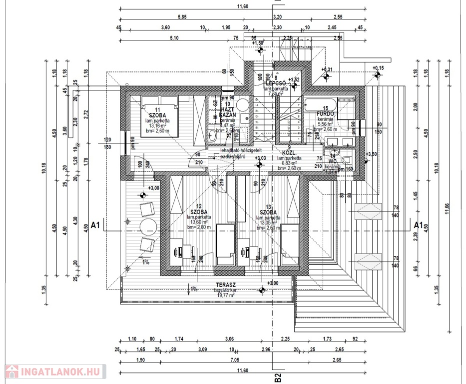 Az emeleten található hálószobákból kettő déli, egy délnyugati tájolású, erkélykapcsolattal. Az északi oldalon található zuhanyzóval, fürdőkáddal és dupla mosdóval rendelkező fürdőszoba, wc és egy háztartási helyiség. Ebben mosógépnek és szárítógépnek is elegendő hely van.