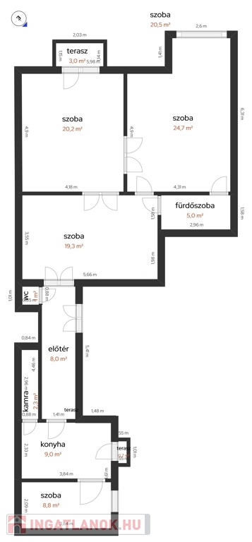A két nagy szoba a Vérmzőre néz. Egy hall-ból nyílik, ami rugalmasan berendezhető, akár étkezőnek is.