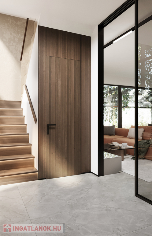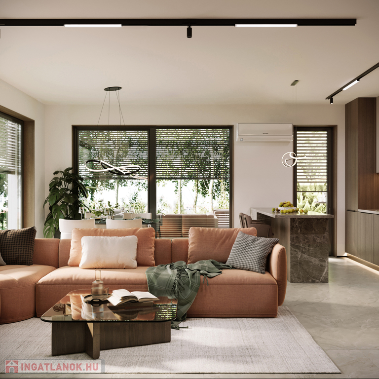 - Földszint: tágas amerikai konyhás nappali közvetlen kijárattal a 43 nm-es, pergolával fedett teraszra, előtér, vendégmosdó, valamint közvetlen átjárás a 18 nm-es garázsba;