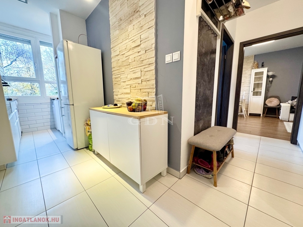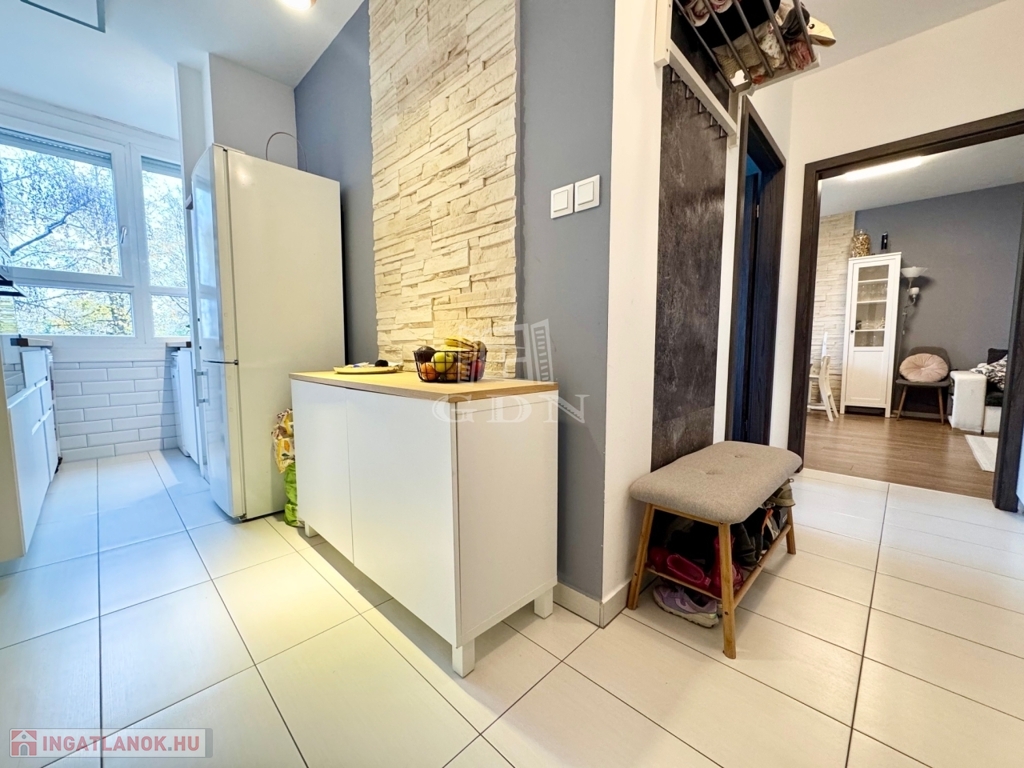 A lakásban a felújítás során: új külső- és belső nyílászárók, vízvezeték, burkolatok, beépített gépek, illetve praktikus és sok tárolási lehetőséget biztosító bútorok kerültek kialakításra.