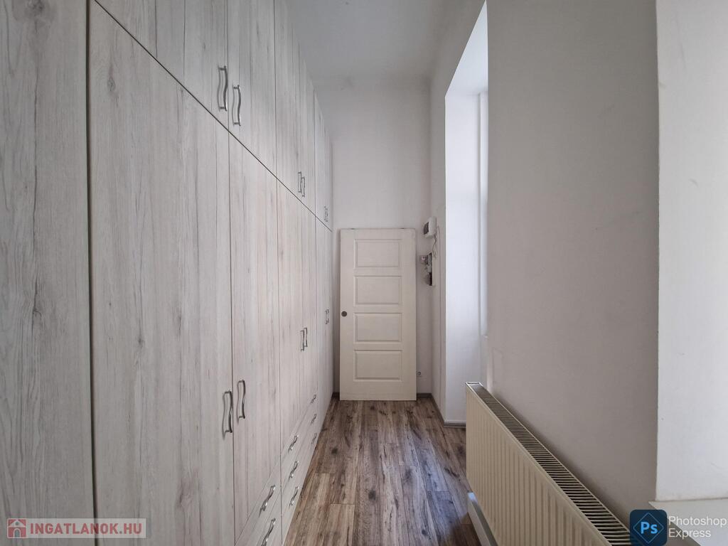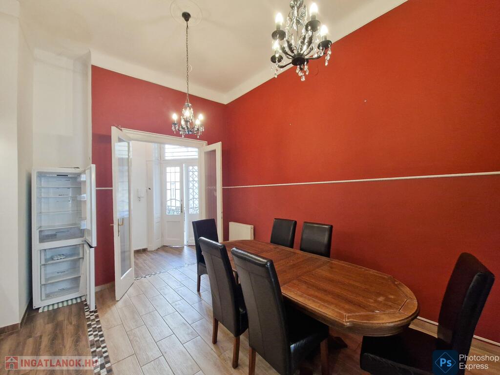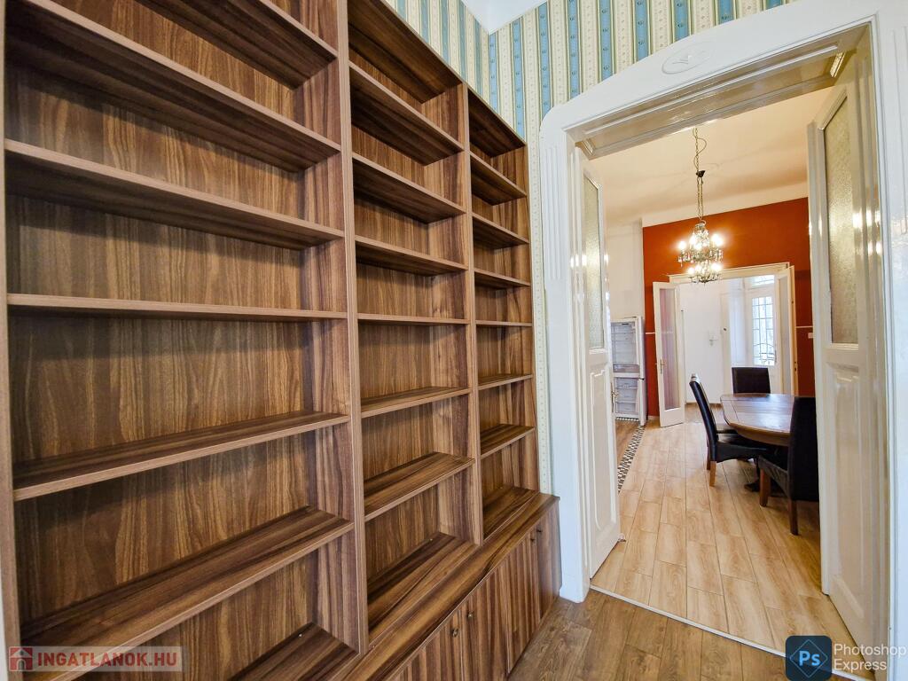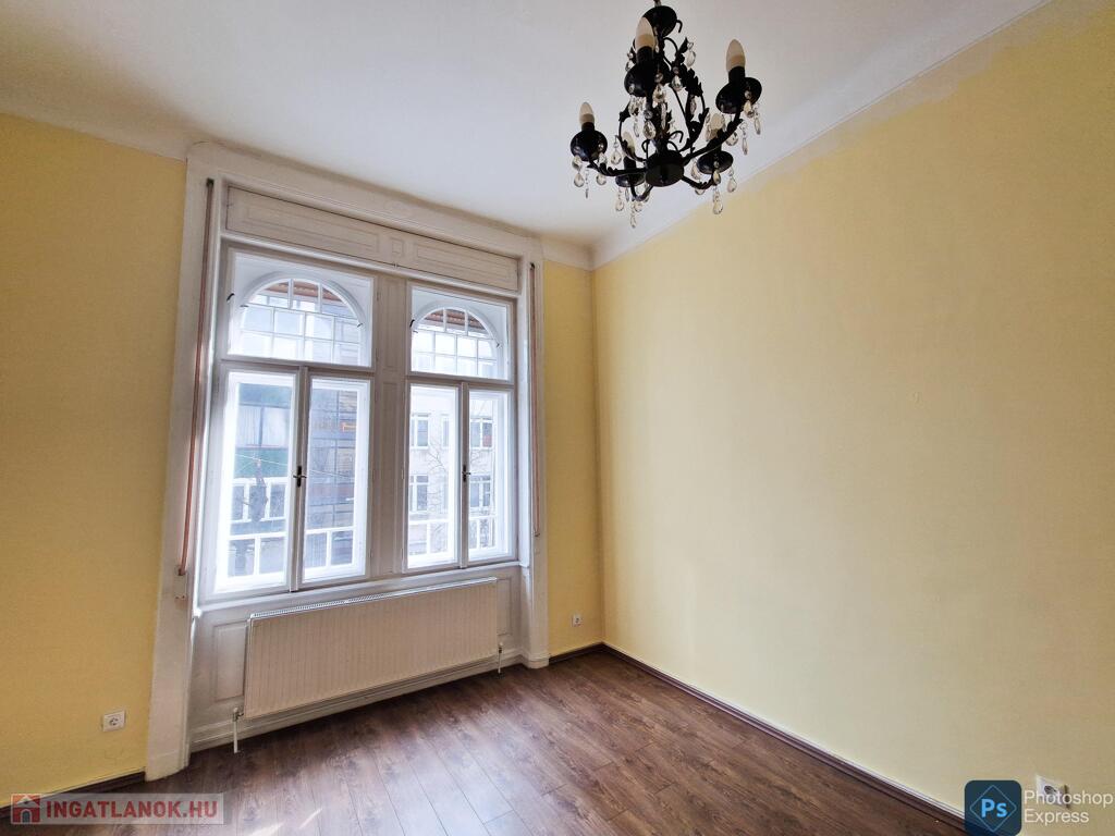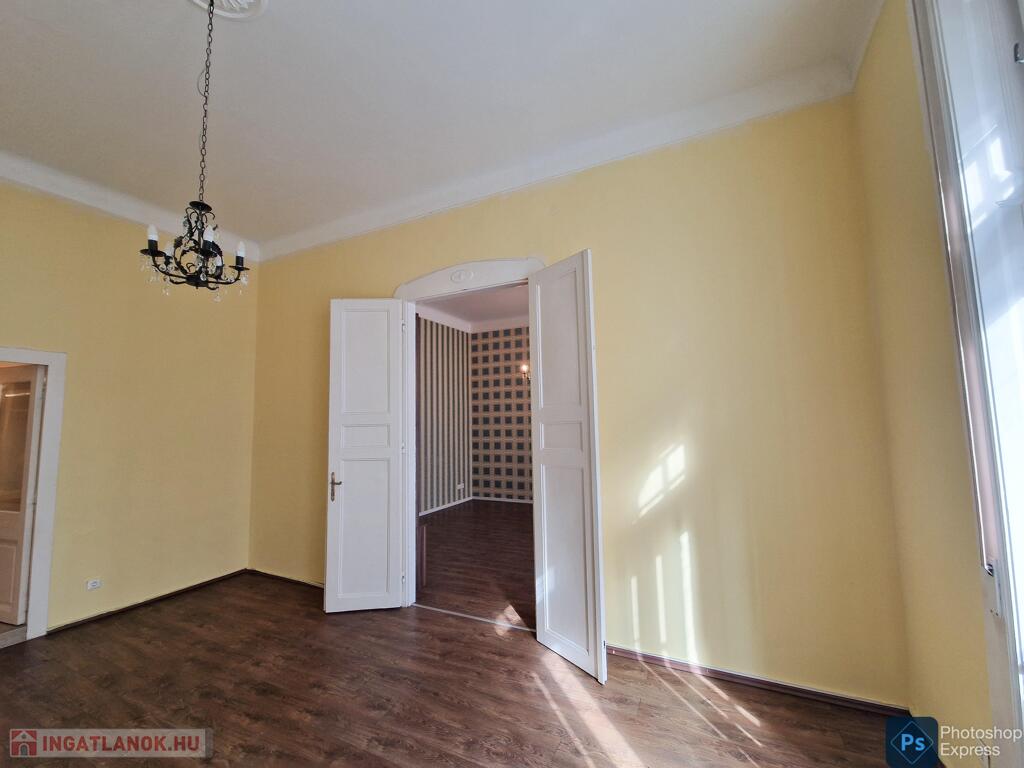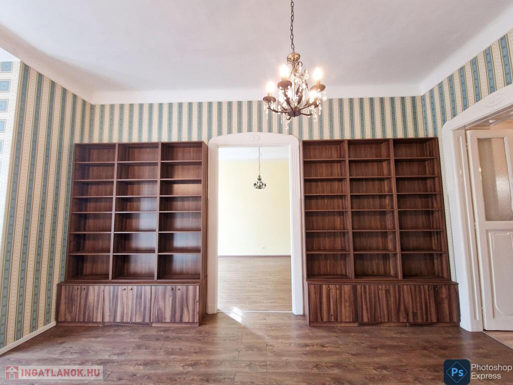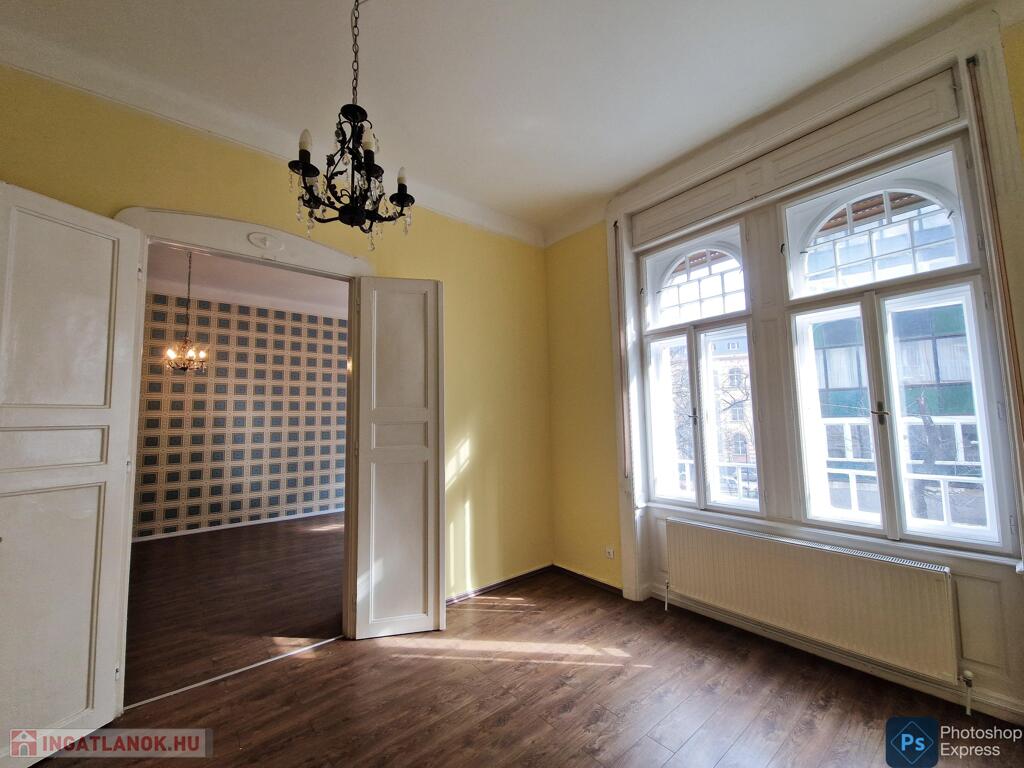 A több,mint 100 éves ház fel van újítva,és csodálatos belső kerttel rendelkezik. Az két lakás egybenyitásával kialakított ingatlan első emeleten található,körfolyosósóról megközelíthető. A kétszárnyú bejárati ajtó tágas előtérbe vezet,és az egész lakást a nagyvonalú ,tágas terek jellemzik.