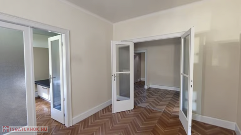 From the ante-room we reach the 11 sqm hall, from which we can access the 3 rooms with separate entrances: the living room is 25.5 sqm, which has a 6 sqm balcony, the bedroom is 20 sqm, and the 3rd room is 7 sqm. There is also a double-wing door between the living room with separate entrance and the bedroom.