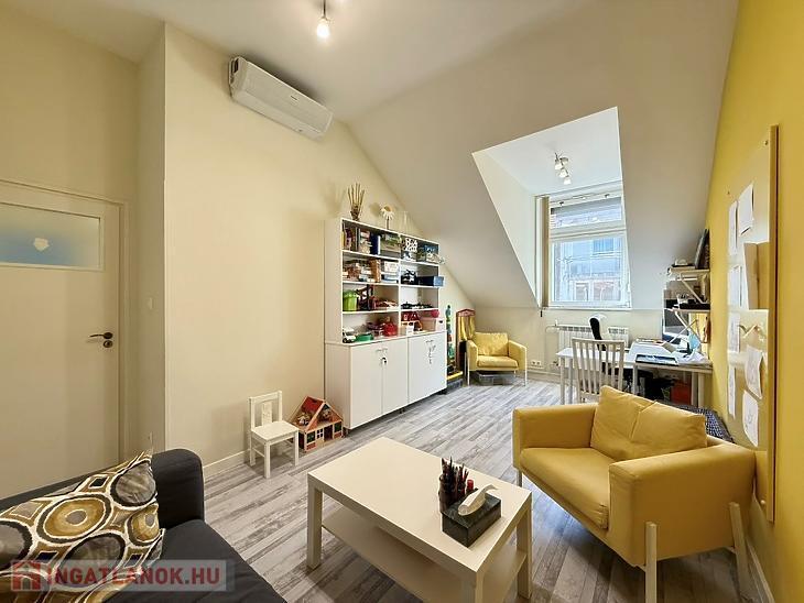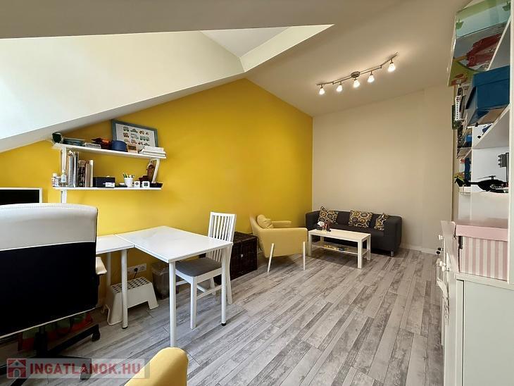A ház legfelső szintjén található lakás különleges hangulatát az ablakoknál megjelenő enyhe tetőtéri lejtés adja, ugyanakkor a belső terekben sehol nincs lejtés, így a lakótér teljes értékű és jól kihasználható.