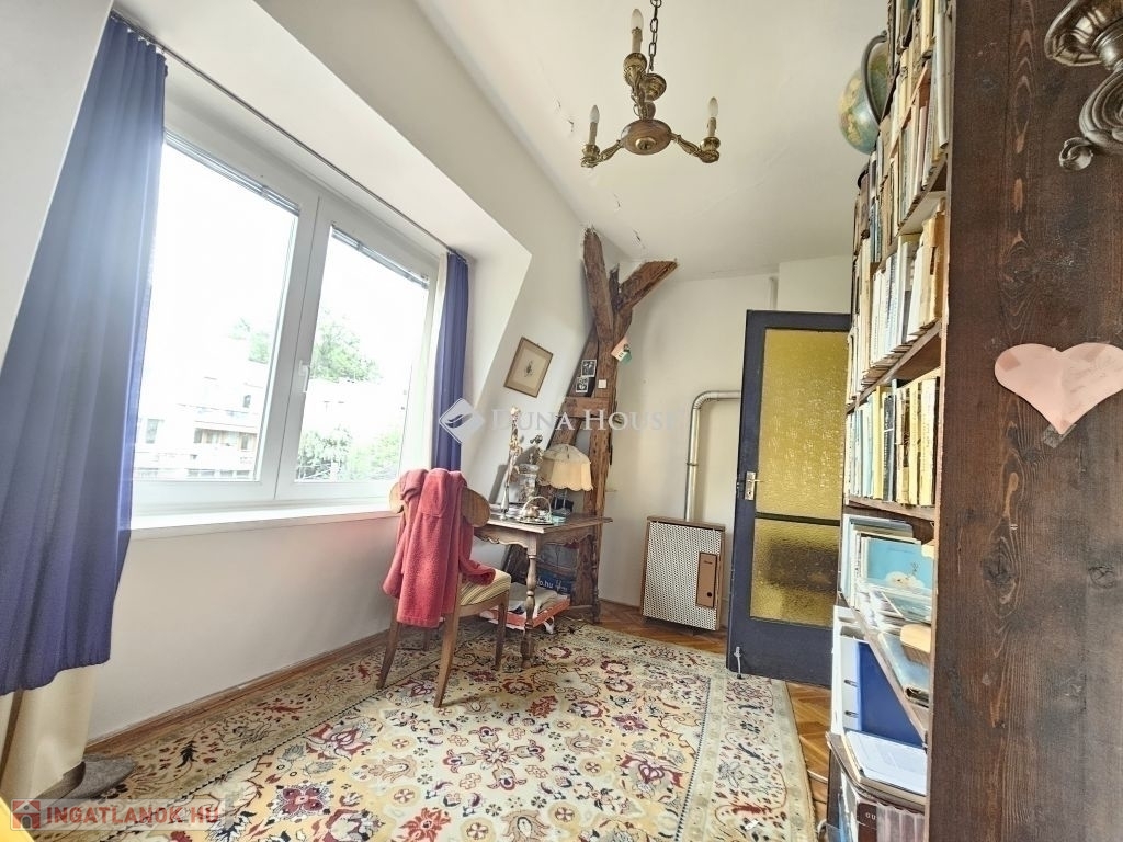 DUNÁRA NÉZŐ PANORÁMÁVAL rendelkező, különleges lakás eladó Rózsadombon!Az 1935-ben épült VILLAÉPÜLET 2. emeletén, a legfelső szinten (de nem tetőtérben!) található ez a - tulajdoni lap szerint 77, a valóságban - 82 négyzetméteres hatalmas nappali + 3 hálószobás lakás. Maga a lakás az 1970-es években került kialakításra és ezen az emeleten nincs is több lakás.A tágas, világos nappaliban található 3 különleges, beépített erkély-szerű építészeti struktúra, amik olvasósarokká, vagy mini télikertekké alakíthatóak. Ebben a helyiségben 3 nagy ablak található, amelyekből csodás a kilátás! A bájos kis konyhából pedig egyenesen a Dunára lehet lelátni a Parlamenttel a háttérben. Még a fürdőszoba ablaka is a csendes, zöld környékre néz!A három hálószoba az utca felé néz, de egyáltalán nem zajos egyrészt azért, mert a kerítéstől jóval beljebb helyezkedik el az épület, másrészt mert egészen kicsi az utca autóforglama. A külön nyíló 3 hálószobát rusztikus tartógerendák teszik még hangulatosabbá.Egy szép, fákkal teli, közös belső kerttel is rendelkezik a ház!Parkolás az utcán megoldható, szabad helyek mindig vannak.A környéken jár a 191-es busz, de gyalog negyed órára már a 17/19/41-es villamosokra is felszállhatunk, amikkel hamar a Széll Kálmán térre, Déli pályaudvarra érhetünk.