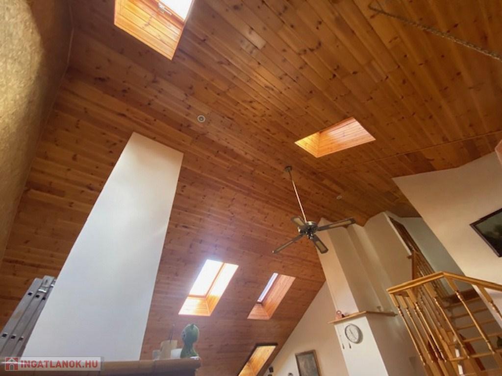 Az előszobából a másik irányba haladva érünk be az ingatlan fő attrakciójához, egy kb 50 nm-es, 4,5 belmagasságú ( legmagasabb pontja) nappaliba. Itt találhatjuk a világos, tágas amerikai konyhát, étkezővel. A nappali további részén jelenleg többek közt pingpong asztal is helyet kapott. Az otthonos, meleg hangulatról a mennyezeti , dupla szigetelésű falambéria, a cserépkályha és egy kandalló gondoskodik.
