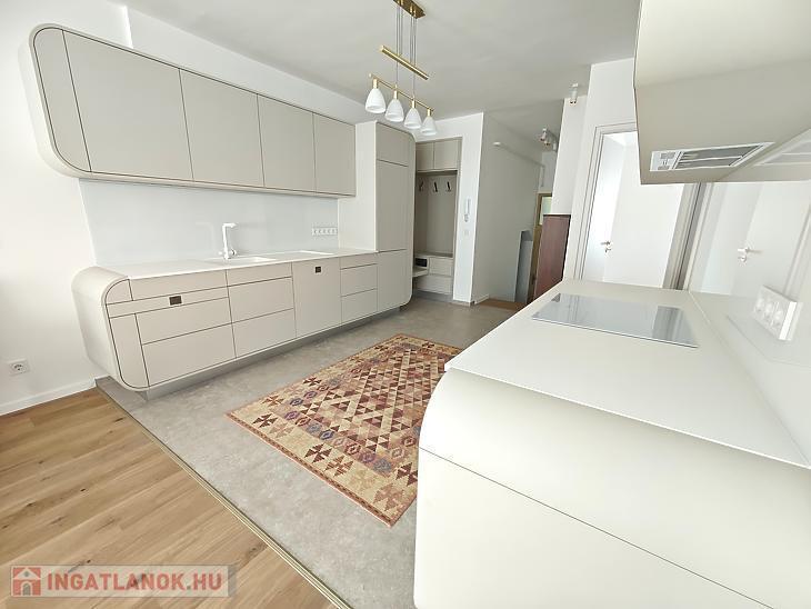 A felső szinten egy amerikai konyhás nappali, hatalmas faltól-falig érő ablakokkal, egy hálószoba és egy fürdőszoba került kialakításra. A nappaliból nyílik a 6nm-es erkély, mely üvegkorlátot kapott. Minden bútor, beleértve a gépesített konyhabútort is, egyedi tervek alapján készültek, kifejezetten ide.