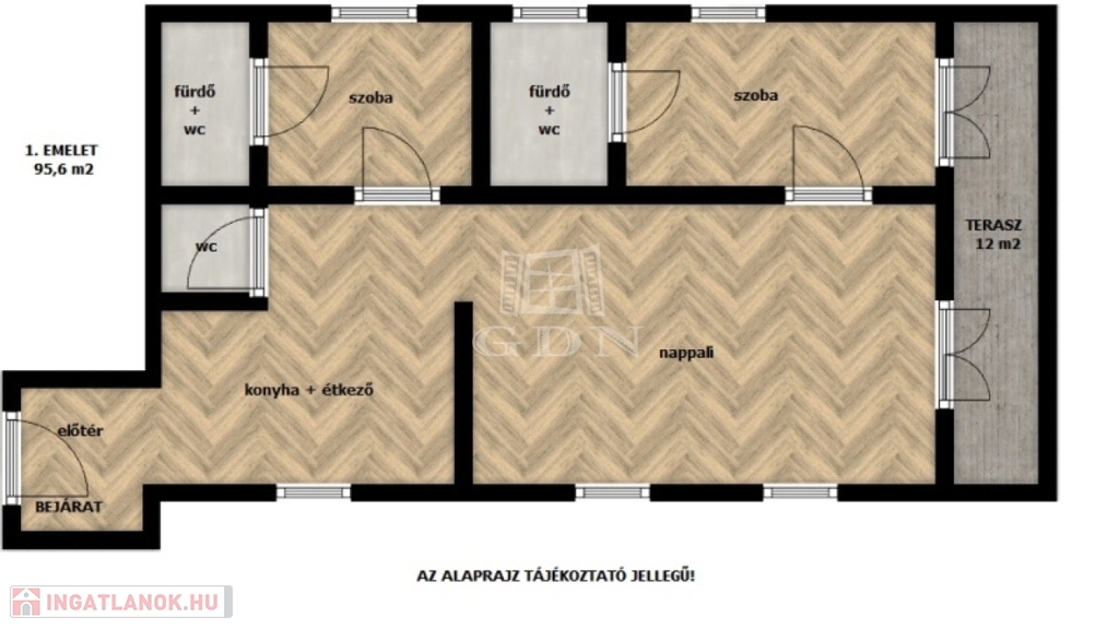 1. EMELET: 95,6 m2 – 3 szoba – 2 fürdő – TERASZ: 12 m2