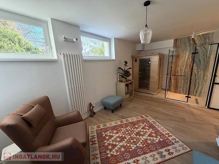 Az alsó szinten egy egyedi szoba kapott helyet. Egyediségét a beépített zuhanykabin és az infraszauna adja. Ezenkívül egy külön wc, egy tároló és a garázs. A garázs parkettázott és szekcionált motoros kapuval ellátott, melynek vételára +15M Ft, kötelezően megvásárolandó.