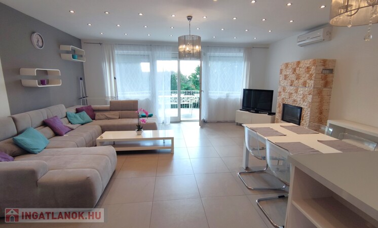 Az amerikai konyhás étkező-nappali hatalmas ablakain árad be a napfény, az erkélyről pazar kilátás nyílik a belső kertre és a medencére. Az elektromos kandalló kellemes hangulatot áraszt. Az ablakok redőnyökkel felszereltek. A lakást 2006-ban teljeskörűen felújították.