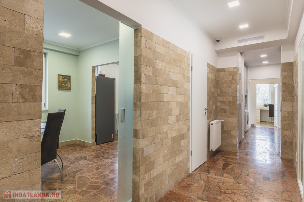 A folyosó oldalai travertini mészkővel vannak ékesítve, melyek kíválóan illeszkednek az egyedi gyártású szekrény és fiókrendszerekhez.